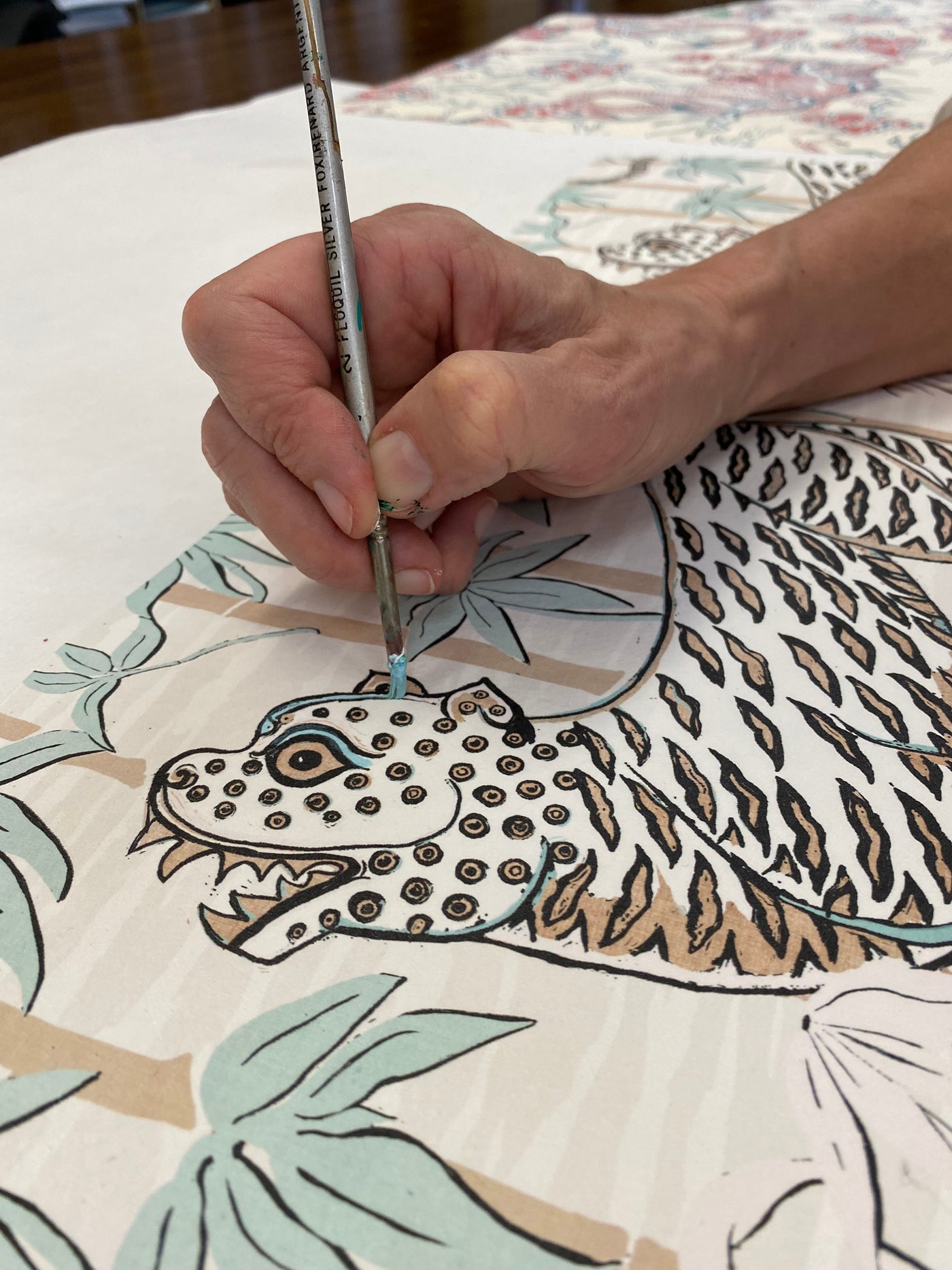 Aux Abris was founded by interior decorator and graphic designer Karen Robert in 2015. Karen Robert has a passion for interiors and founded Aux Abris out of the desire to add a layer of her own wallpaper patterns to her interior design projects. Her design aesthetic was honed during her many years living in Paris, London and Milan; she likes well-worn rooms with quirky modern touches and an exuberance of color, texture and pattern. The name “Aux Abris” means “take shelter” which is a nod to both her vacation house in Shelter Island, and her husband who is half French. This year, Robert (pronounced the french way ROW_BEAR ) is excited to launch a textile line which, like her wallpapers, will also be manufactured at her studio .